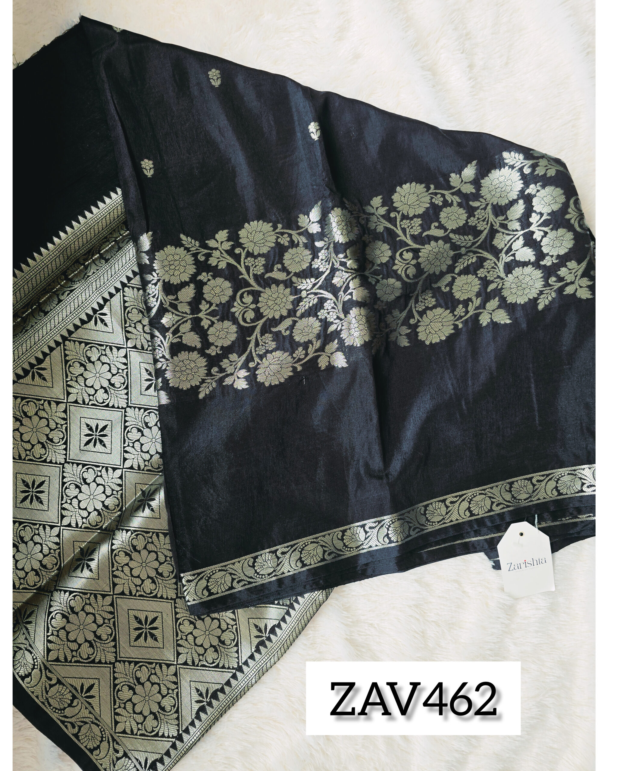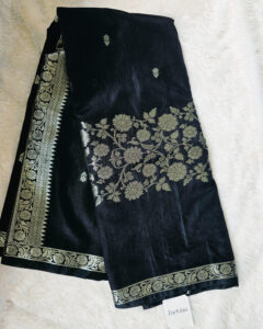 This Stunning Black Semi Katan Saree Features a Luxurious Silver Gold Zari Weaving, creating a beautiful contrast enhancing the richness of the drape.