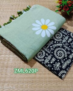 Experience timeless elegance with our Khadi Cotton Saree. The saree features a rich Pastel green base adorned with a charming hand-painted daisy motif, embodying simplicity and grace.