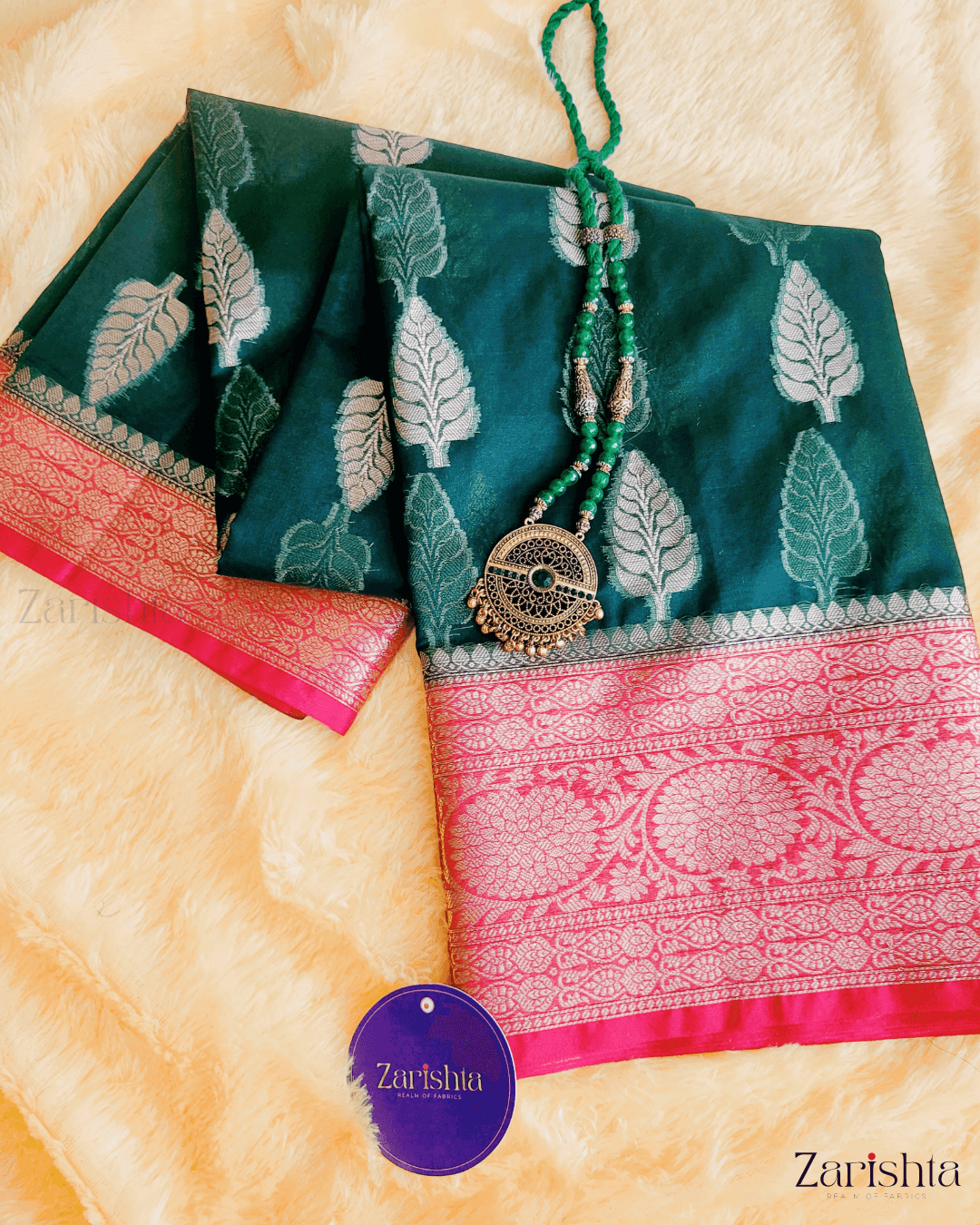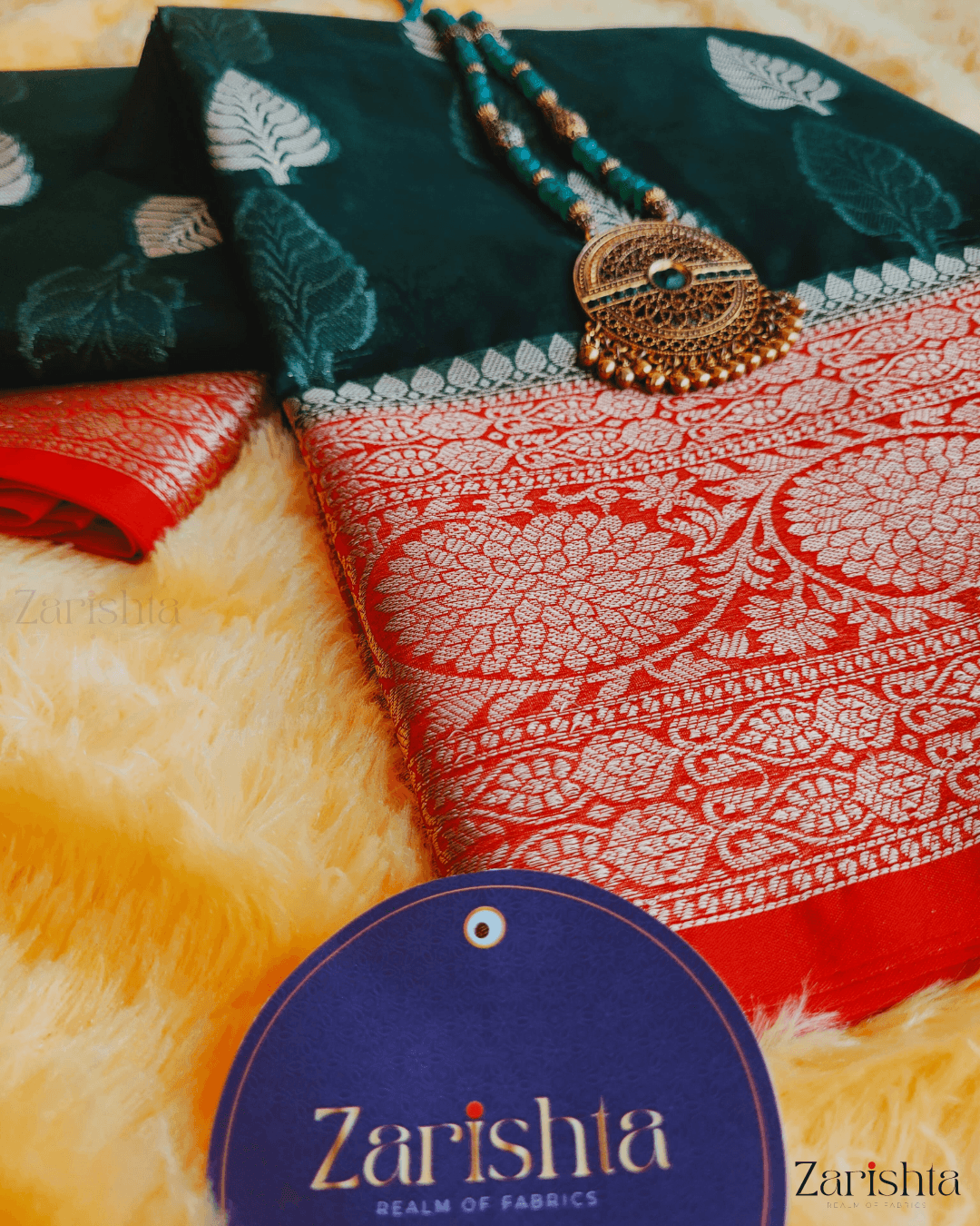 The saree’s dark green color contrasts beautifully with the golden zari work, and the red Banarasi border enhances its regal appeal.